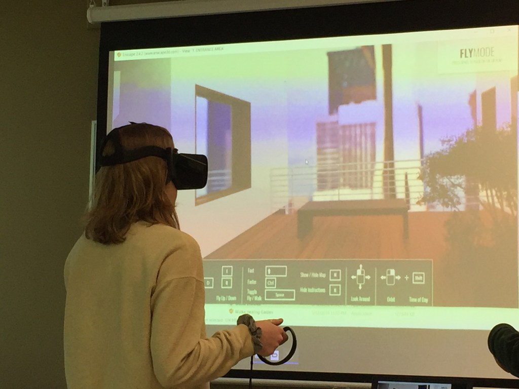 According to Director of Interior Architecture Programs, Myoung Joo Chun, “VR brings the students into their own designed spaces and allows them to pre-explore their user’s experience. They find out how their design dimensions feel. It places real emphasis on the clearance and heights in the drawings. VR helps to bring attention to their way-finding in their design much more than if they use just a floor plan.”